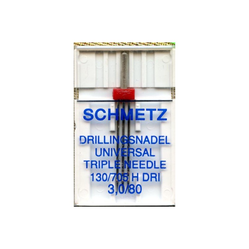 21387 Adata triguba 130/705 H-DRI 3.0/80. Atstumas tarp kraštinių adatų smaigalių 3.0 mm, adatos numeris - 80. Speciali adata, skirta suformuoti trispalvę dekoratyvinę siūlę.