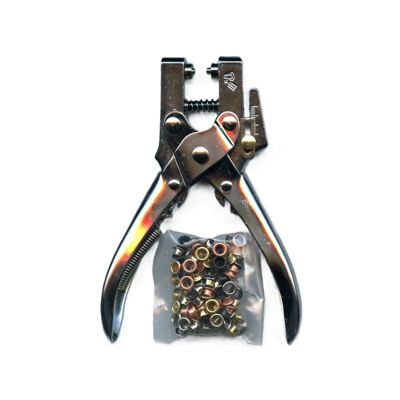 18136 Replės 4.8 mm akučių įpresavimui art.NS-T0013. Rinkinį sudaro replės ir 100 vnt. įvairių spalvų akučių. Replės naudojamos ir kaip skylmušis.