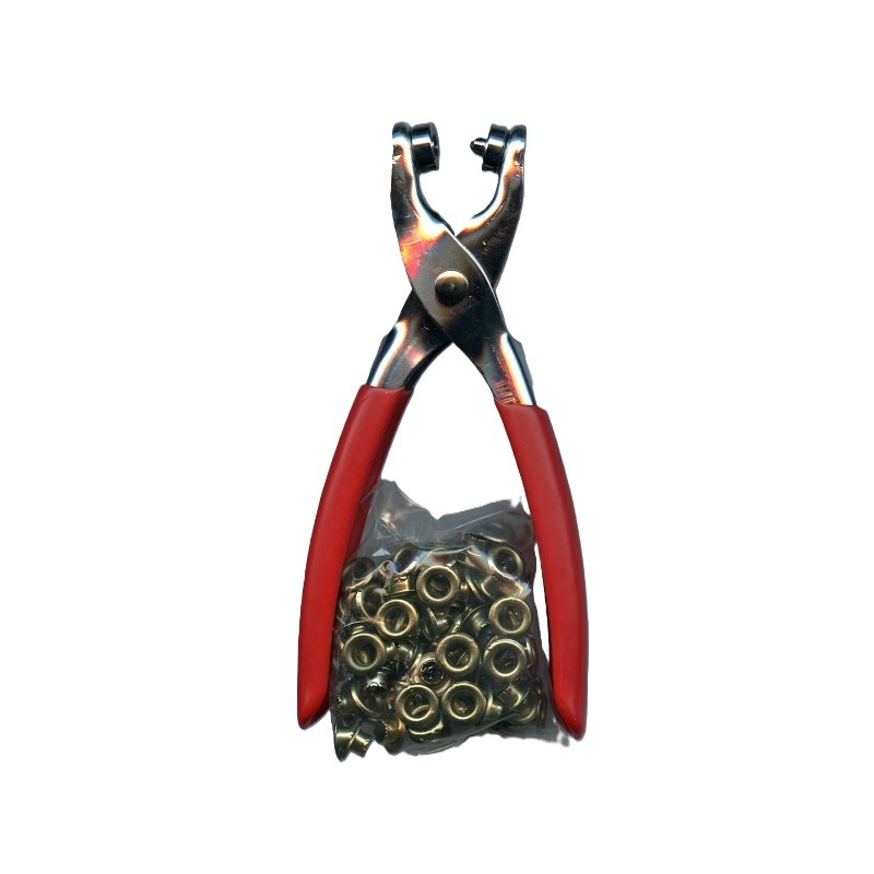 18135 Replės 6 mm akučių įpresavimui art.NS64-T0012. Rinkinį sudaro replės ir 100 vnt. žalvario spalvų akučių.