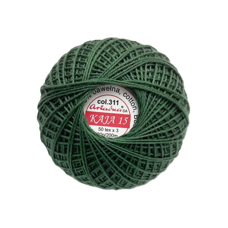 3567/311 Medvilniniai nėrimo siūlai "Kaja"vienspalviai. Siūlų storis - 50 tex x3, 30g, 200m. Spalva 311 - tamsi žalia.