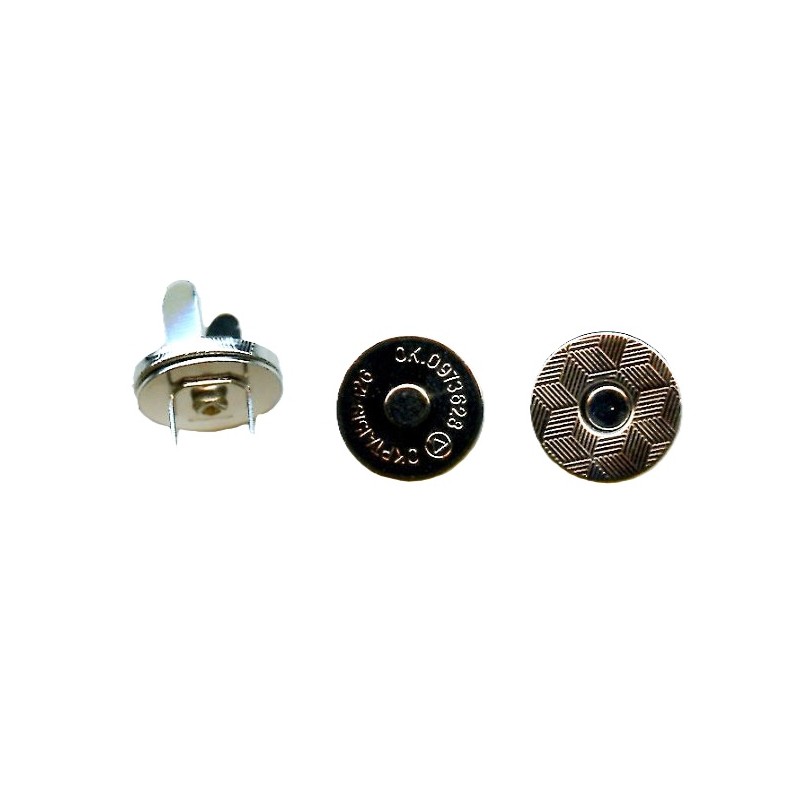 18328 Galanterinis plonas magnetinis užsegimas, skersmuo - 14 mm, storis - 1.8/0.8 mm, spalva - nikelio. Tvirtinamas "ūsais" Kaina už 1 vnt.