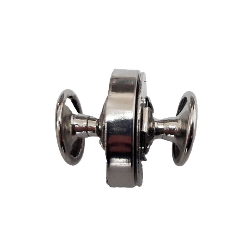 20417 Galanterinis magnetinis užsegimas, kurio abi pusės tvirtinamos su kniede. Užsegimo skersmuo - 18 mm, storis - 4.5 mm, spalva - nikelio. Kniedės kepurėlės skersmuo - 12.5 mm. Kaina už 1 vnt.